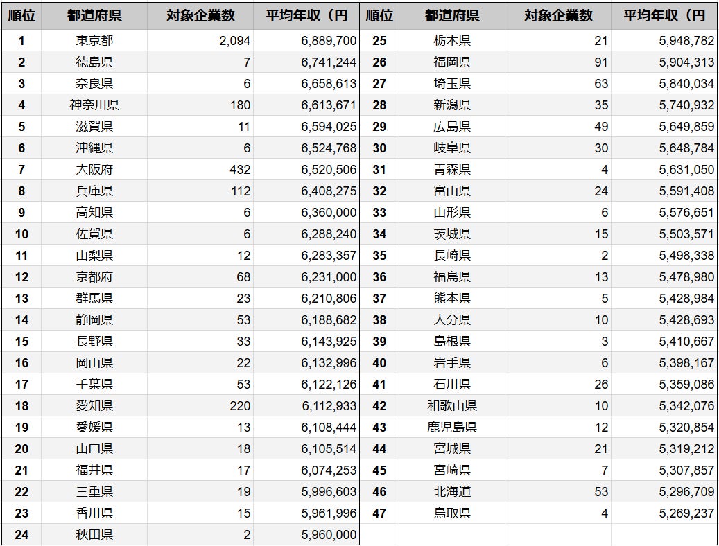 「SalesNow DB」のデータをもとに、全国47都道府県の平均年収を集計したところ、1位は東京都で6,889,700円という結果になりました。続いて、徳島県(6,741,244円)、奈良県(6,658,613円)がランクインし、地方からの上位入りも目立つ結果となりました。