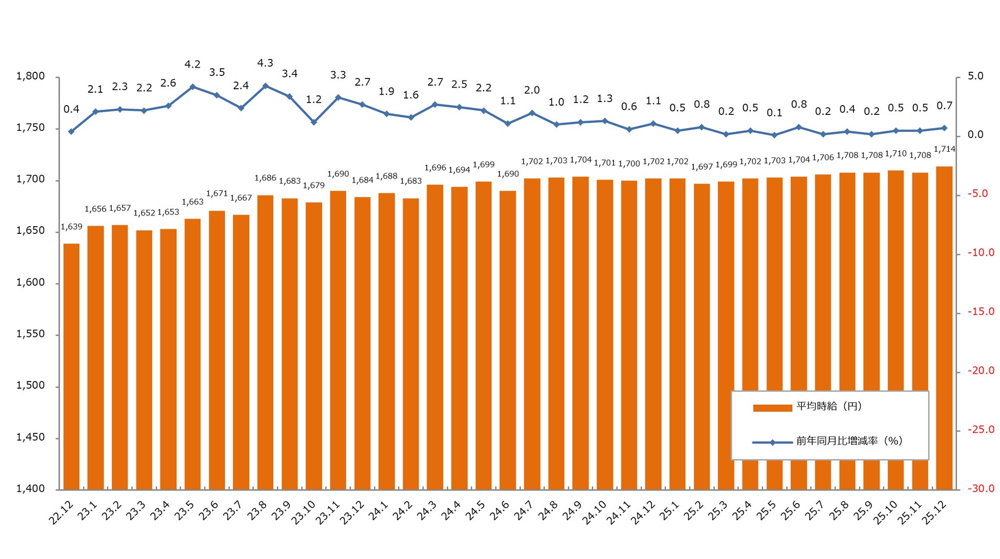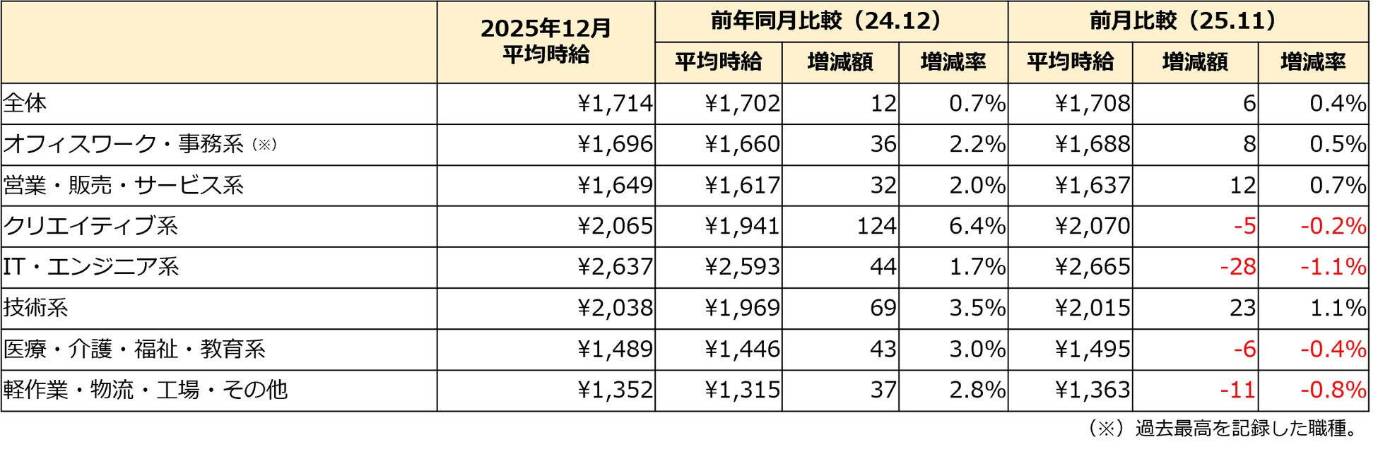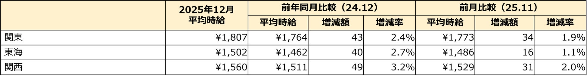2025年12月度の三大都市圏平均時給は1,714円(前月比+6円・0.4%増、前年同月比+12円・0.7%増)で過去最高を記録。前年同月を上回るのは39ヵ月連続です。