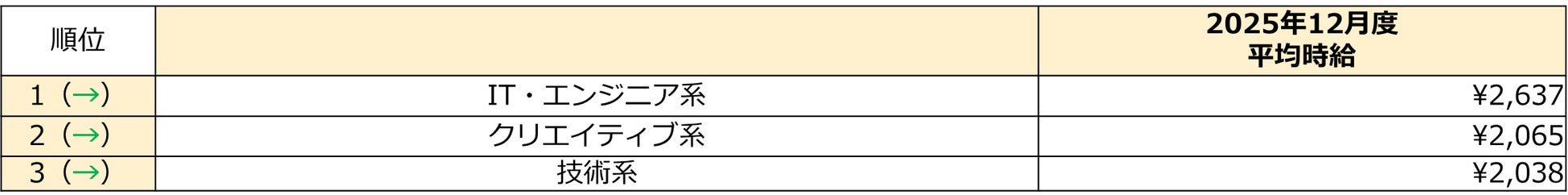 IT・エンジニア系は2,637円(前年同月比+44円)と大幅な上昇に。例年12月は人材の流動性が低くなる時期ですが、新たに市場に出る案件が「上流工程の開発」といった高単価求人に限定されたことが要因の一つです。また、低時給帯であった「テストエンジニア」等がAIに代替され募集自体が減少。高時給求人の比率の高まりが、平均を押し上げる一因となっています。