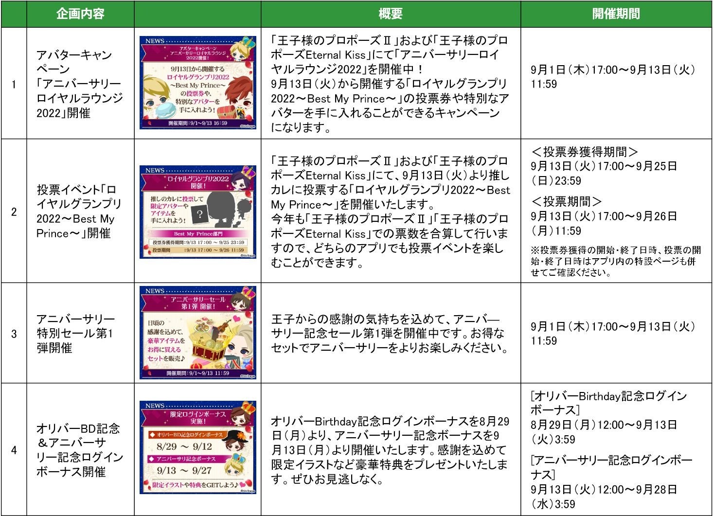 本作は、王子様たちとのドラマチックな恋愛が体験できるボル恋タイトルで、配信開始以降高い人気を誇っております。そしてこの度、「王子様のプロポーズⅡ」は9月11日(日)に9周年、「王子様のプロポーズEternal Kiss」は9月27日(火)に6周年を迎えます。