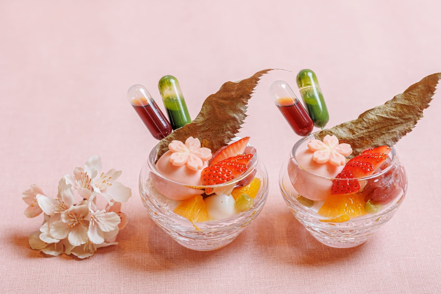 春の訪れを感じるシーズンは、フレッシュなフルーツやアイスを使用したさっぱり食べられるあんみつが新登場。桜の葉の塩漬けの塩味をアクセントにしており、スポイトに入っている黒蜜と抹茶の2種のソースをご自身でかけて、自分だけのオリジナルあんみつを堪能できます。