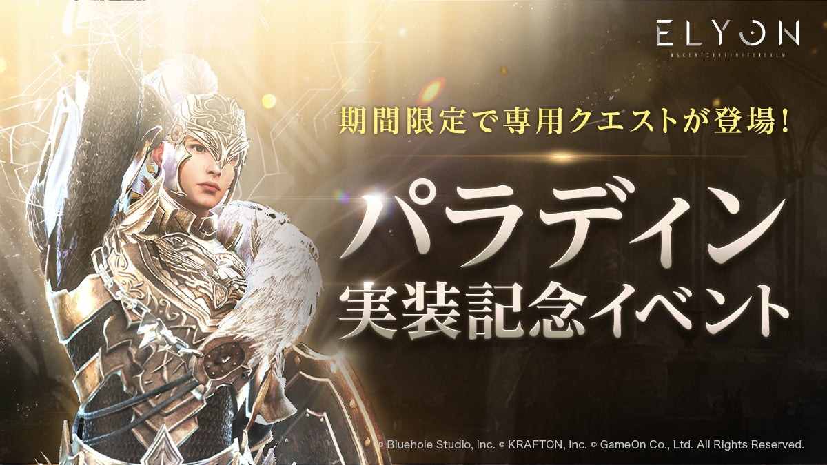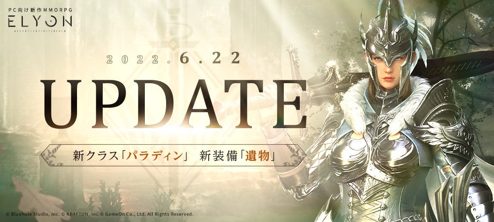 株式会社ゲームオン[本社:東京都渋谷区、代表取締役社長:文 智秀(ムン・ジス)]が運営する新作MMORPG『ELYON』(以下『エリオン』)につきまして、新クラス「パラディン」、新装備「遺物」、バランス調整、マナ覚醒新シーズンを含むアップデートを2022年6月22日(水)に実施いたしました。また、アップデートを記念した様々なイベントも本日より開始しております。