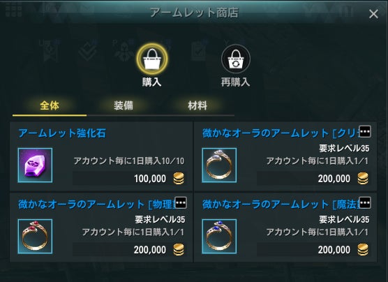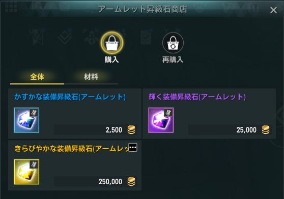 ※アームレットと強化石、昇級石はNPCより購入も可能です。