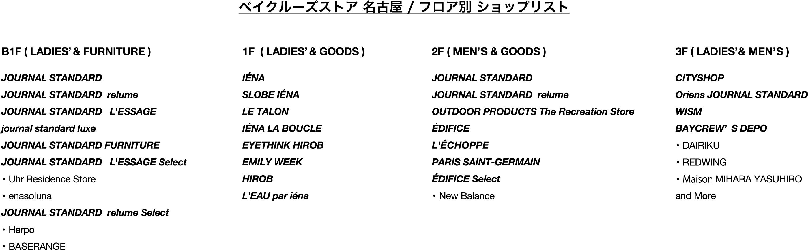 3/24(木)にグランドオープンを迎えるベイクルーズストア 名古屋では、JOURNAL STANDARD(レディース&メンズ)、IÉNA(レディース)、ÉDIFICE(メンズ)などの人気ブランドをはじめ、CITYSHOP(レディース)、L'ÉCHOPPE(メンズ)WISM(メンズ)といった東海地方初出店ブランドを含む20ブランドが集結します。