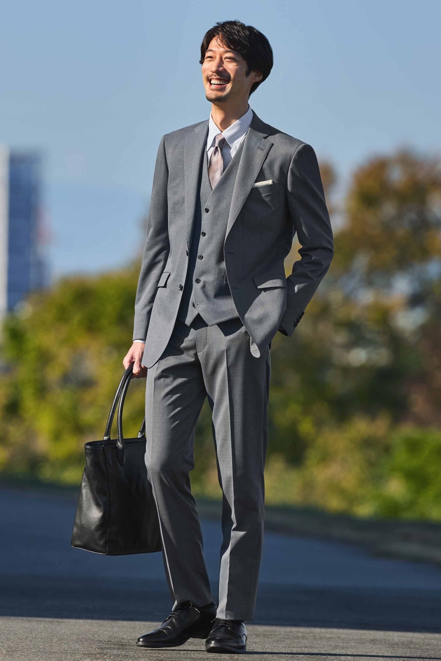 タイドアップでキリッと引き締めたVゾーンに同素材のベストを重ねて、大人の男性らしい重厚感をプラス。グレーカラーの持つ誠実で上品な雰囲気が、ハレの日をより特別な日へと導いてくれます。