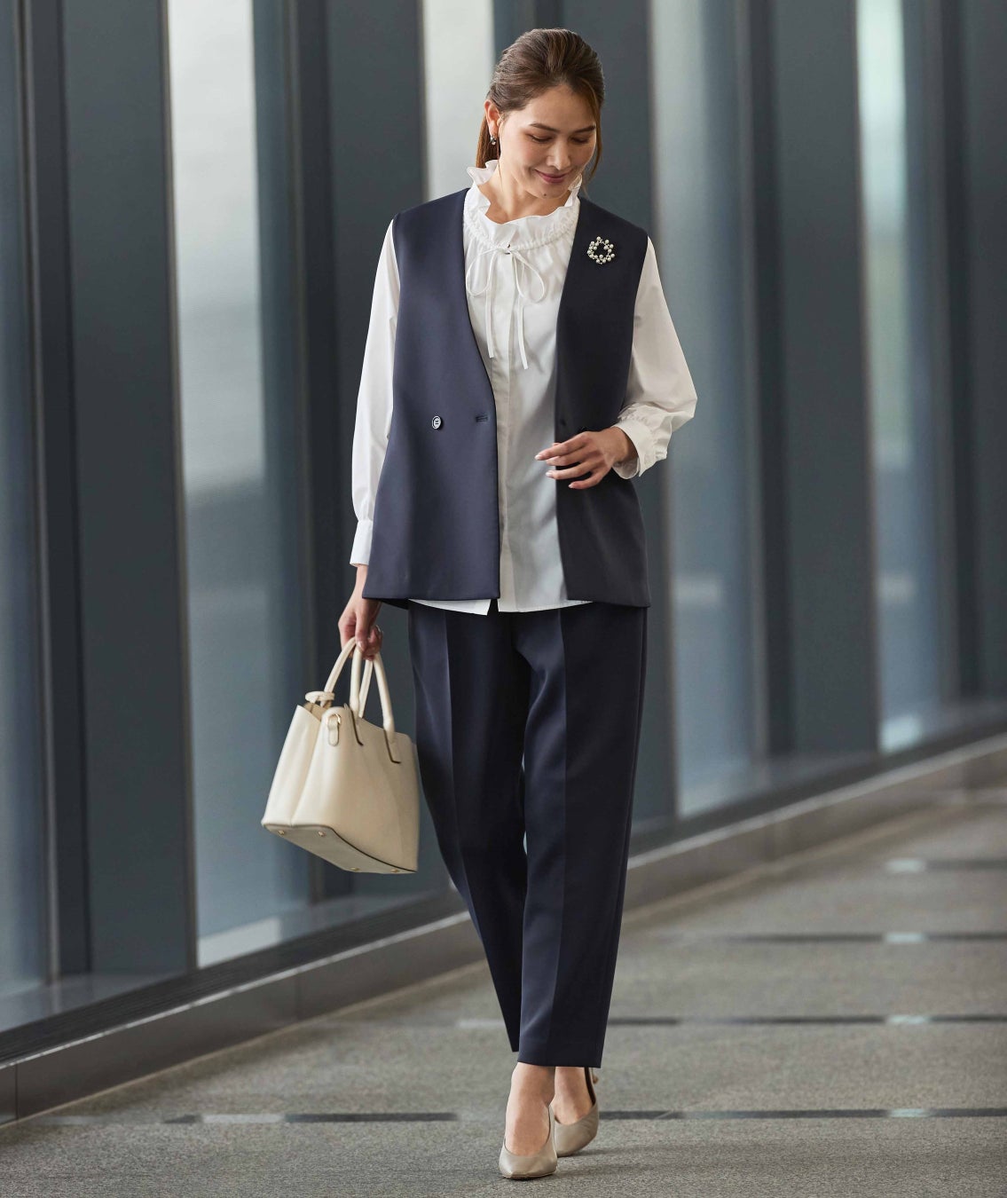 近年人気のあるジレを主役にした、トレンド感のある「ハレの日」の装いです。同素材のパンツと組み合わせることで、控えめなアクセサリーでもサマになる、シンプルながらも上品なスタイリングが完成します。