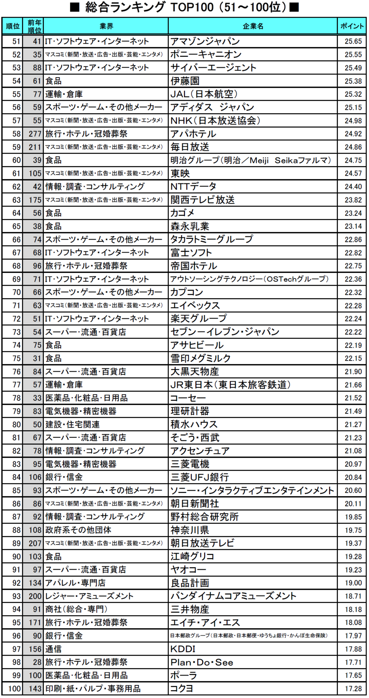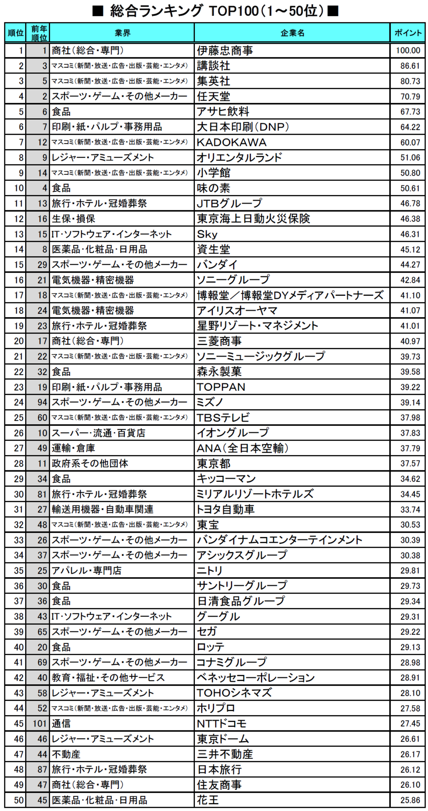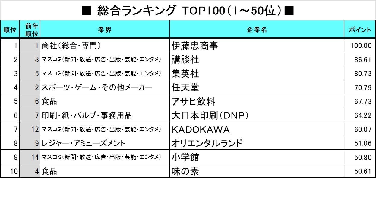(3)5位のアサヒ飲料、10位の味の素など、食品は安定してランクイン。50位以内に7社が入る