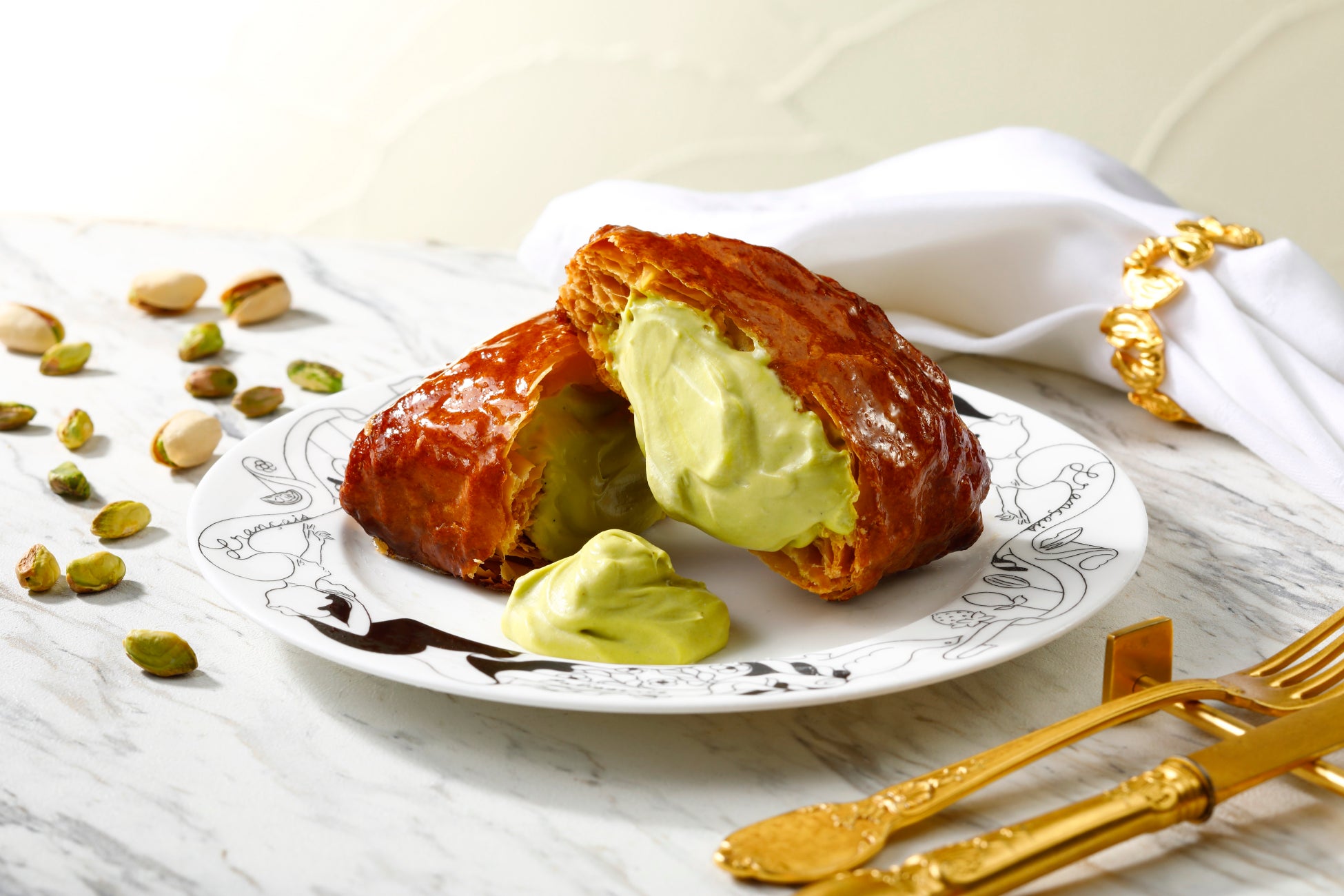幾重にも重なった薄い生地が柔らかい空気の層をつくり、クリームをやさしく包み込みます。クリームは北海道産生クリームにマスカルポーネとカスタード、ピスタチオペーストをブレンドしたコクのある味わい。