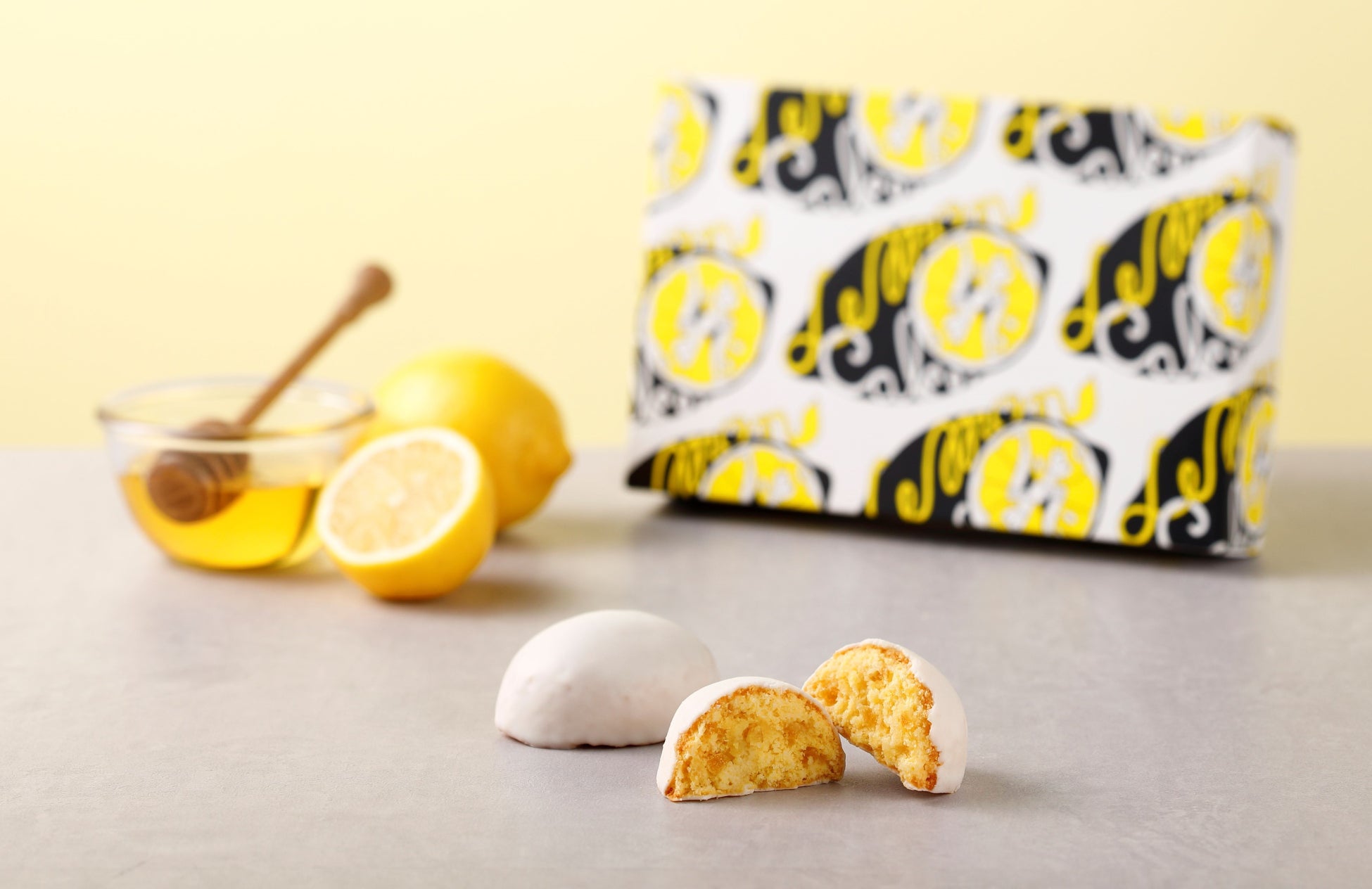 レモンピール、蜂蜜を加え、しっとりと焼き上げた生地をレモン風味のホワイトチョコレートでコーティングいたしました。爽やかな香りと、甘さを抑えたレモンの風味をお楽しみいただける、かわいらしいレモン型のレモンケーキです。