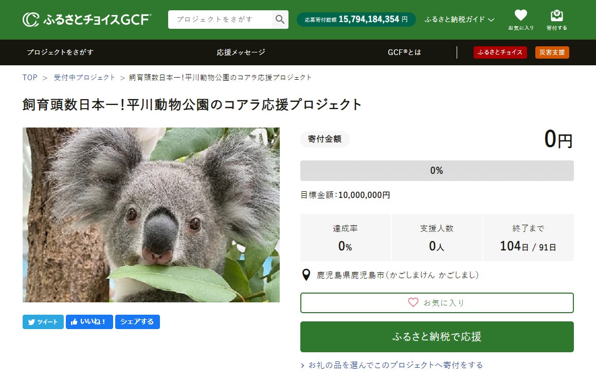 鹿児島県鹿児島市とふるさとチョイス、ふるさと納税制度を活用したガバメントクラウドファンディング®で、平川動物公園のコアラのエサの安定供給を目的としたプロジェクトを開始