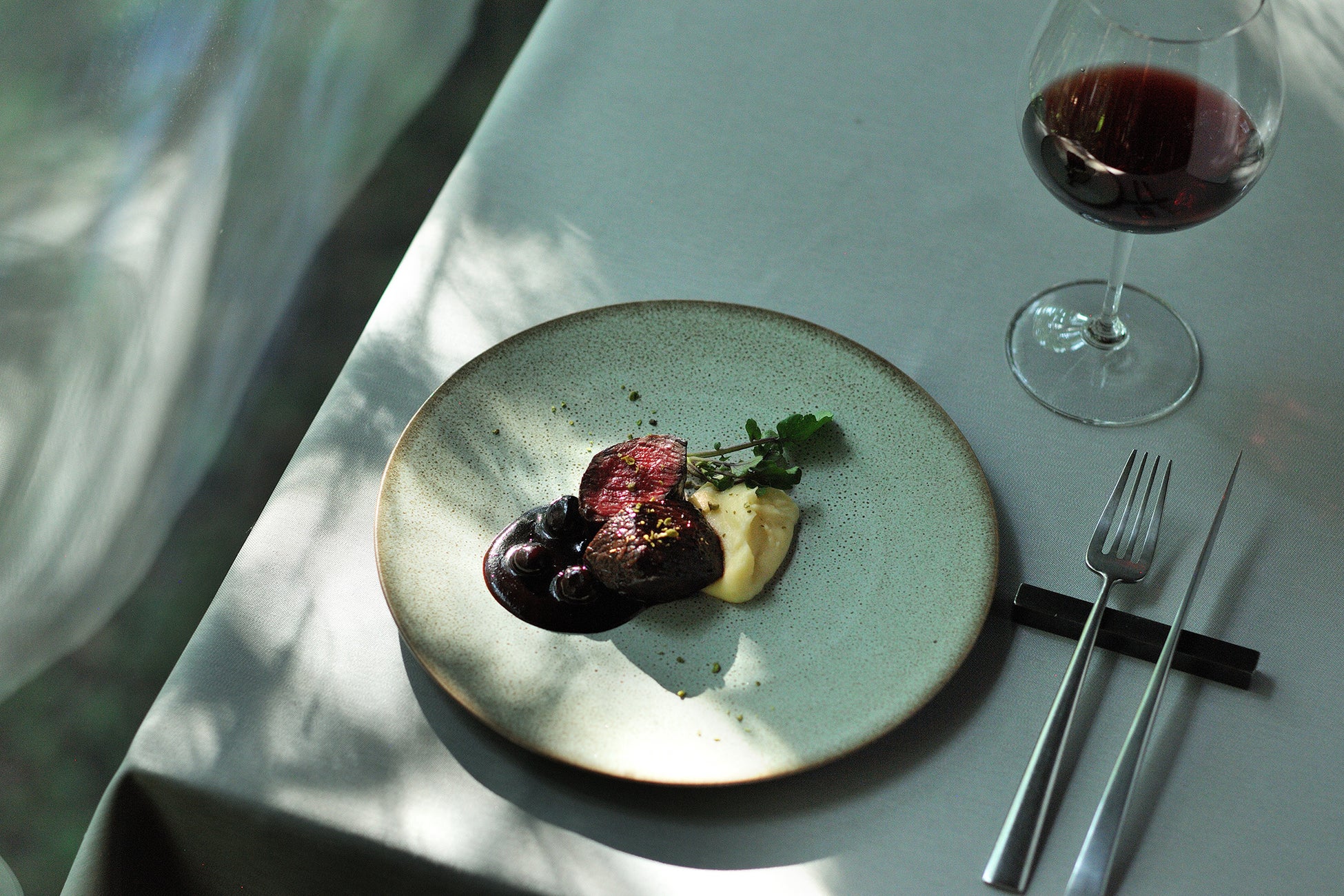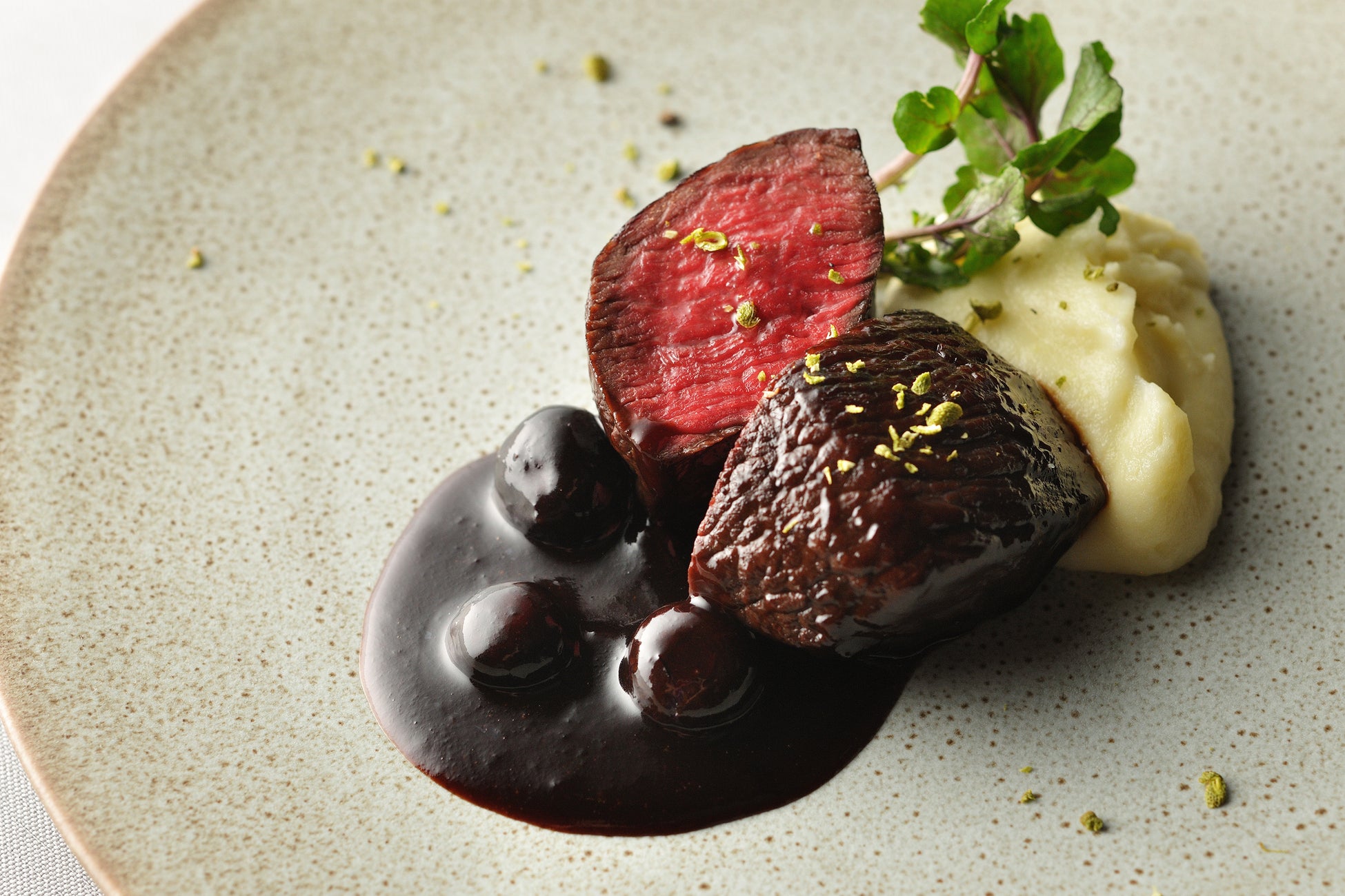 低温でじっくりと火を入れた鹿肉を、テーブル上でブルーベリーソースとともに軽く煮込んで仕上げます。甘酸っぱいソースが鹿肉の旨味を引き立て、付け合わせの滑らかなポムピューレ(*3)がより一層贅沢な味わいを添えます。