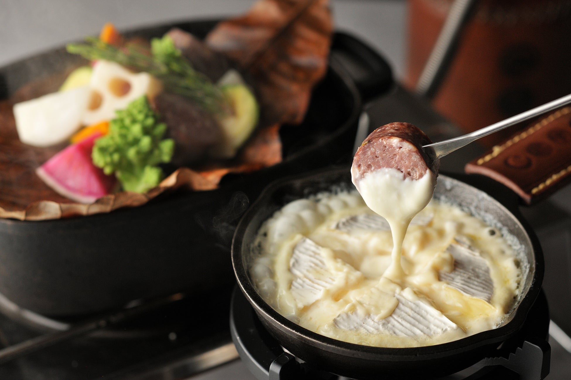 鹿肉サルシッチャ(*1)と根菜などの冬野菜を朴葉に包み、溶岩石を敷き詰めたダッチオーブンで蒸し焼きにしました。白州ウイスキーを合わせたカマンベールチーズにつけ、アツアツのまま楽しめます。鹿肉サルシッチャの旨味を、まろやかなカマンベールチーズが引き立てます。