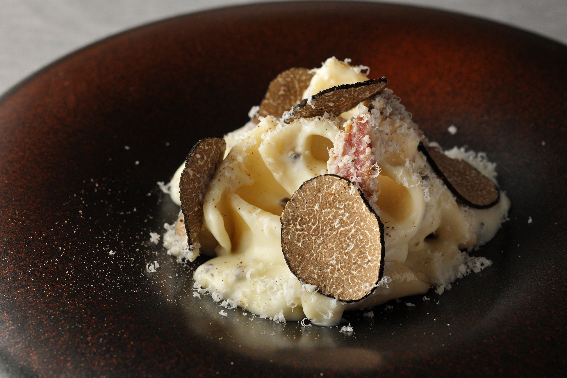 猪肉を塩漬けし熟成させた猪パンチェッタを、ゆり根とともにクリームパスタに仕上げました。パスタには山梨の郷土料理の”みみ”(*2)を使い、濃厚なクリームパスタにしました。仕上げにトリュフを入れ、香りを楽しみながら、噛むほどにコクと深みを感じることができる1品です。