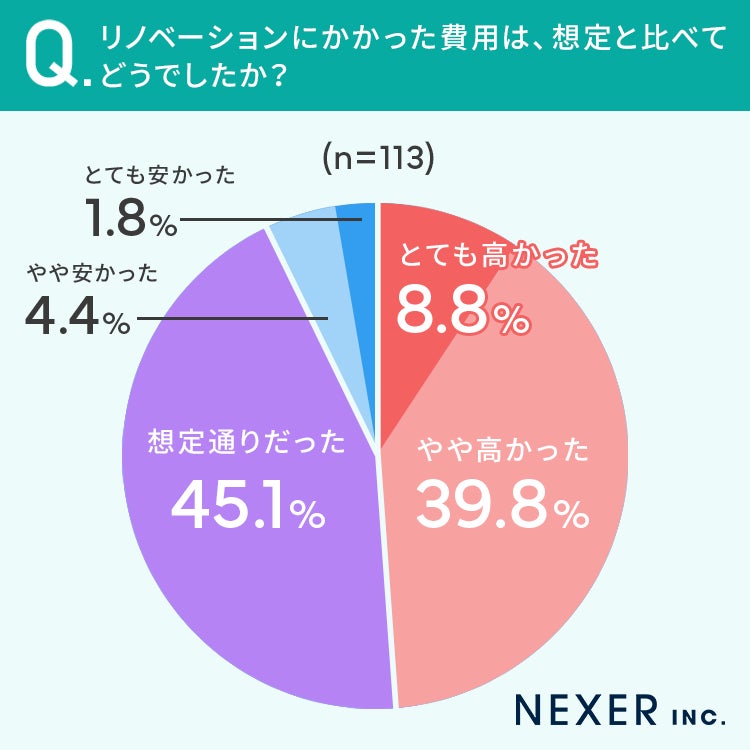 さらにリノベーションにかかった費用について、45.1%と半数近くの方が「想定通りだった」と答えた一方で、半数以上の方が「想定と比べて高かった」もしくは「安かった」と回答しています。