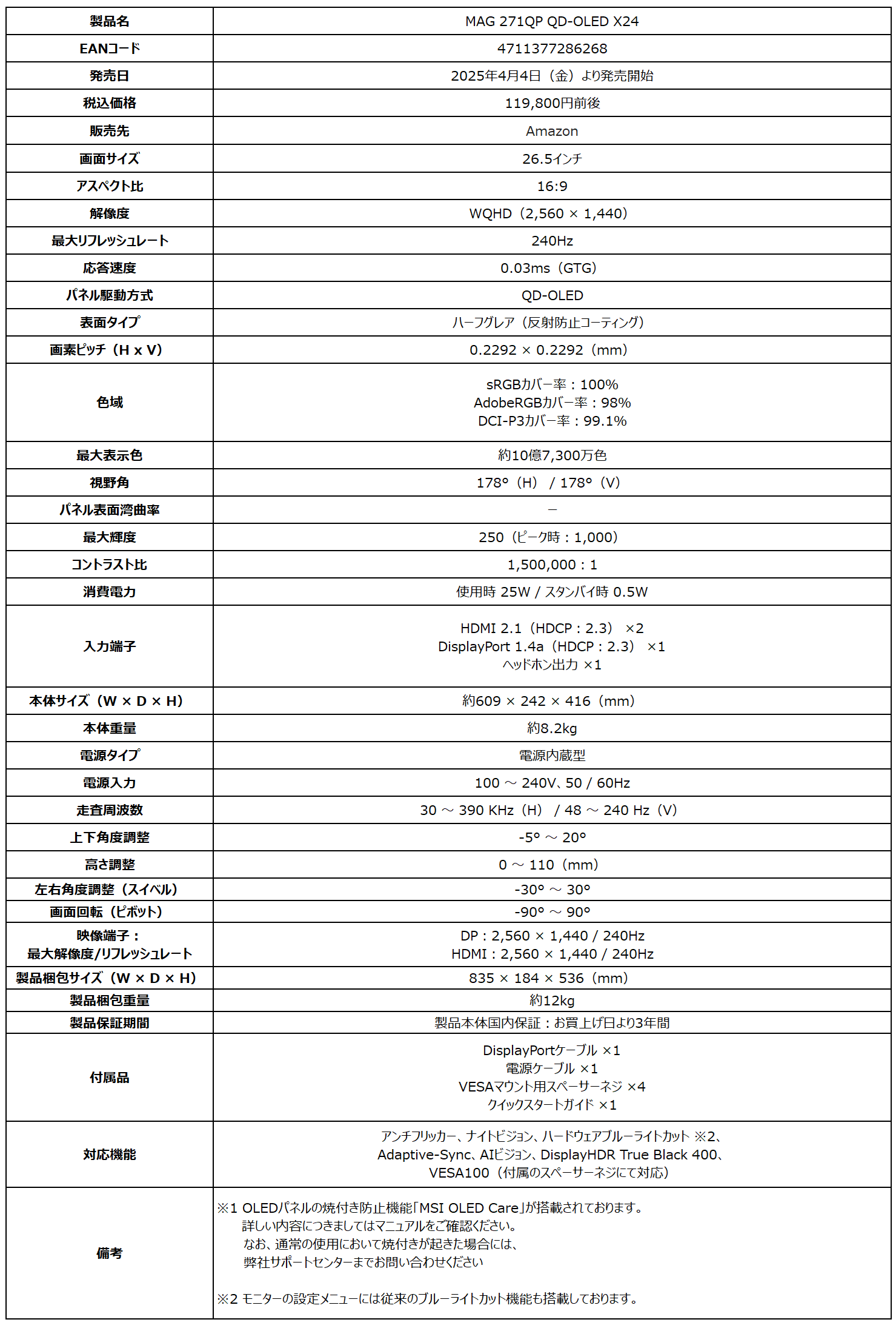 製品ページ: https://jp.msi.com/Monitor/MAG-271QP-QD-OLED-X24