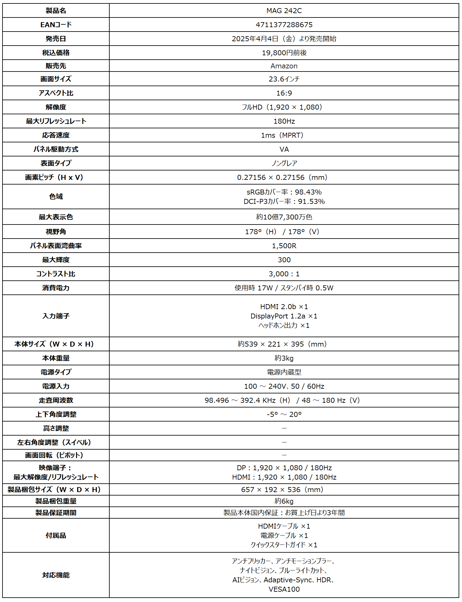 この度、エムエスアイコンピュータージャパン株式会社は2025年4月4日(金)より、ゲーミングモニターの新モデルを2製品発売いたします。高いゲーミング性能とコストパフォーマンスに優れた『MAG』シリーズから、次世代の映像美を体験できるQD-OLEDパネルを搭載し、26.5インチWQHD、リフレッシュレート240Hz・応答速度0.03ms(GTG)の高いゲーミングスペックを誇る「MAG 271QP QD-OLED X24」、高い没入感を体験可能な湾曲パネルを搭載し、23.6インチフルHD、リフレッシュレート180Hz・応答速度1msの「MAG 242C」が新たにラインナップに加わります。
