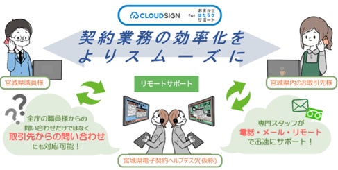 また、「宮城県電子契約ヘルプデスク」として、電子契約サービスの利用方法やトラブルシュートなどについて宮城県の職員さまから宮城県の取引先さままで一元サポート(電話・メール・リモートサポート)する専用ヘルプデスクも導入し、より円滑な地域のDX推進も支援してまいります。