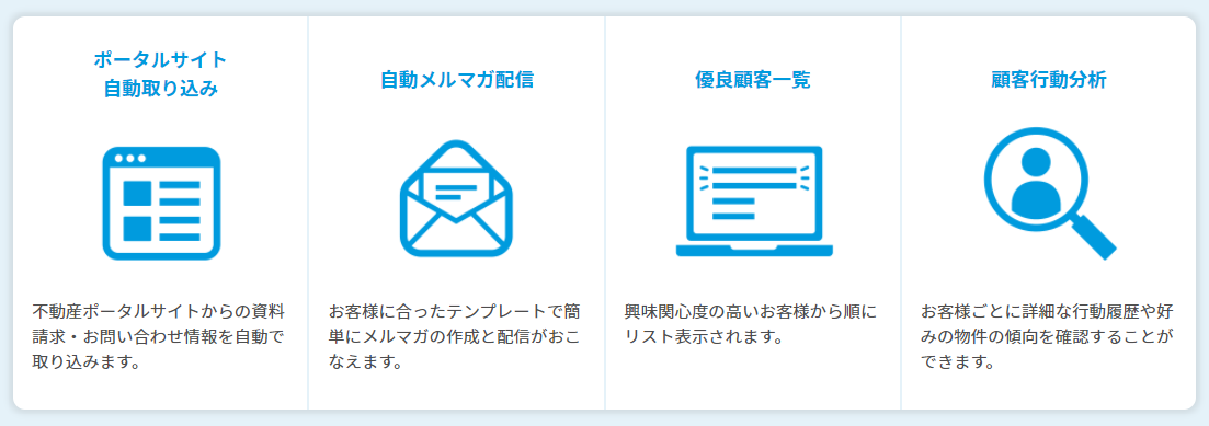 新着物件情報や不動産売買のお役立ち情報など自動メール配信機能によって、漏れなく・長期的に・自動でお客様を追客することができ、またお客様の活動履歴の分析・可視化により、関心度の高いお客様の嗜好に合わせた営業活動が可能となります。