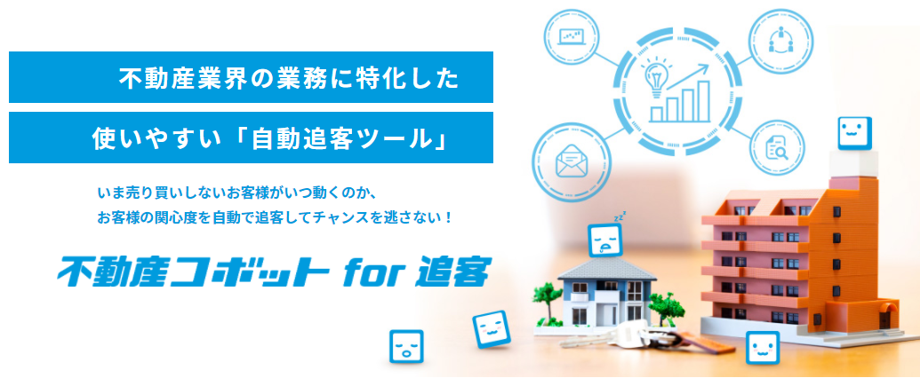 「不動産コボット for 追客」は、不動産業界に特化した、営業・マーケティング活動を支援するMA(マーケティングオートメーション)ツールです。