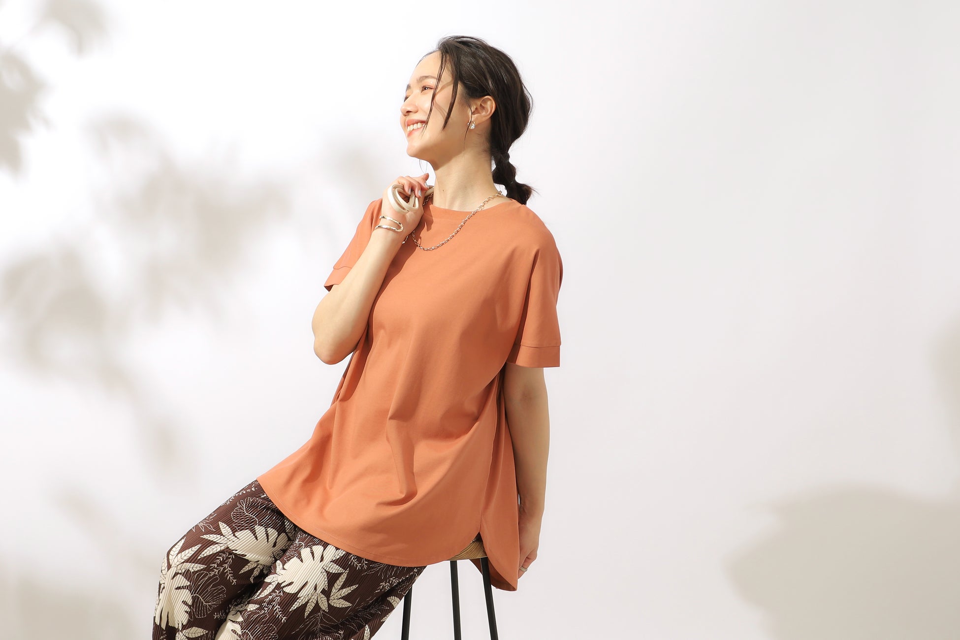 ▪デザイン:ゆったりとしたシルエットなので気になる腰回りや二の腕もカバー。カーブした裾のラインがアクセントになっています。ウエストインしやすく、ワイドパンツやスカートもバランスよく着用いただけます。