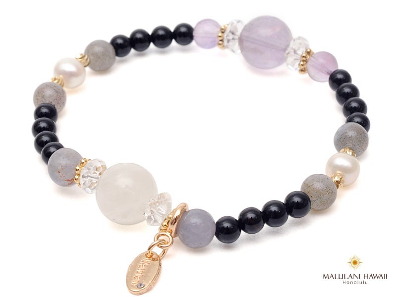 大ぶりのムーンストーン&フローライトに、タンザナイトやラブラドライト、アメジストをちりばめ、オニキスでまとめたブレスレット。