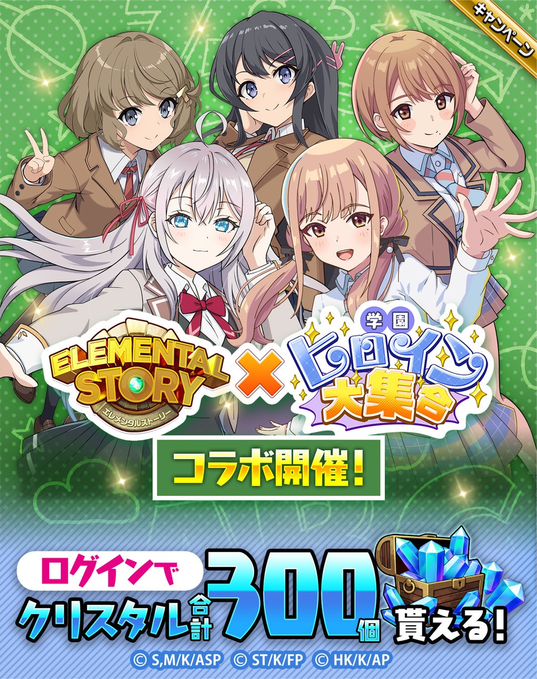 ログインボーナスでクリスタル最大300個がもらえる他、コラボを記念して「ヒロインの学校称号を集めようキャンペーンⅡ」を開催いたします。