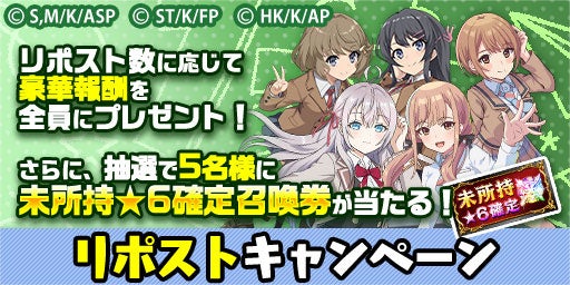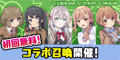 今回のコラボ召喚では「★6 桜島麻衣」、「★6 古賀朋絵」、「★6 アリサ・ミハイロヴナ・九条」、「★6 神宮寺琉実」、「★6 神宮寺那織」、「★5 梓川花楓」、「★5 双葉理央」、「★5 豊浜のどか」が登場します。