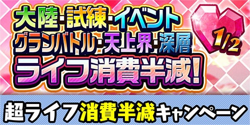 期間中、大陸・試練・イベント・グランバトル・天上界NORMAL・現代大陸深層・アリーナクエストで消費するライフが半減されます。
