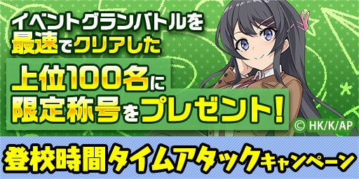 開催期間中、コラボイベントグランバトル「登校時間タイムアタック」に挑み、最速でのクリアタイムを競い合うキャンペーンになります。