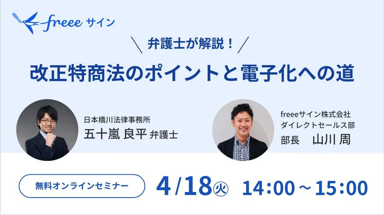 freeeグループのfreeeサイン株式会社が無料のオンラインセミナー「弁護士が解説!改正特商法のポイントと電子化への道」を4月18日(火)14時に開催いたします。