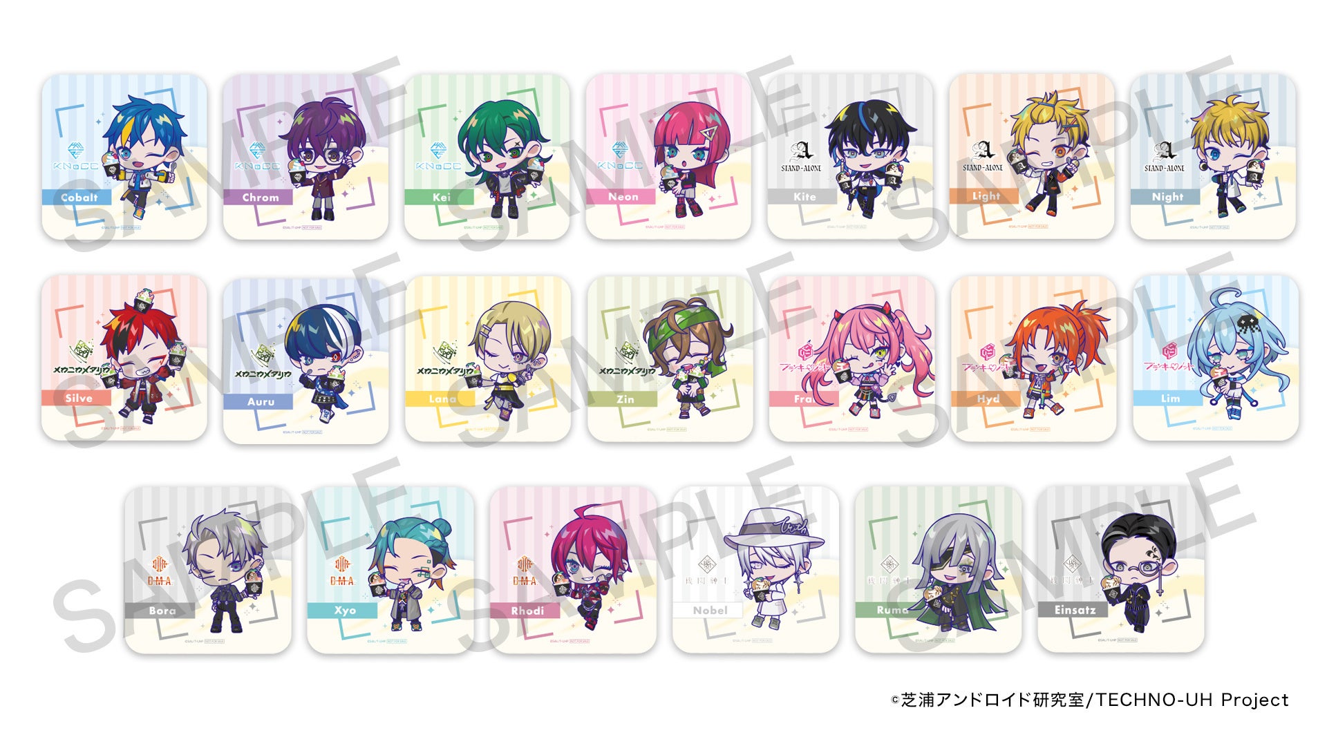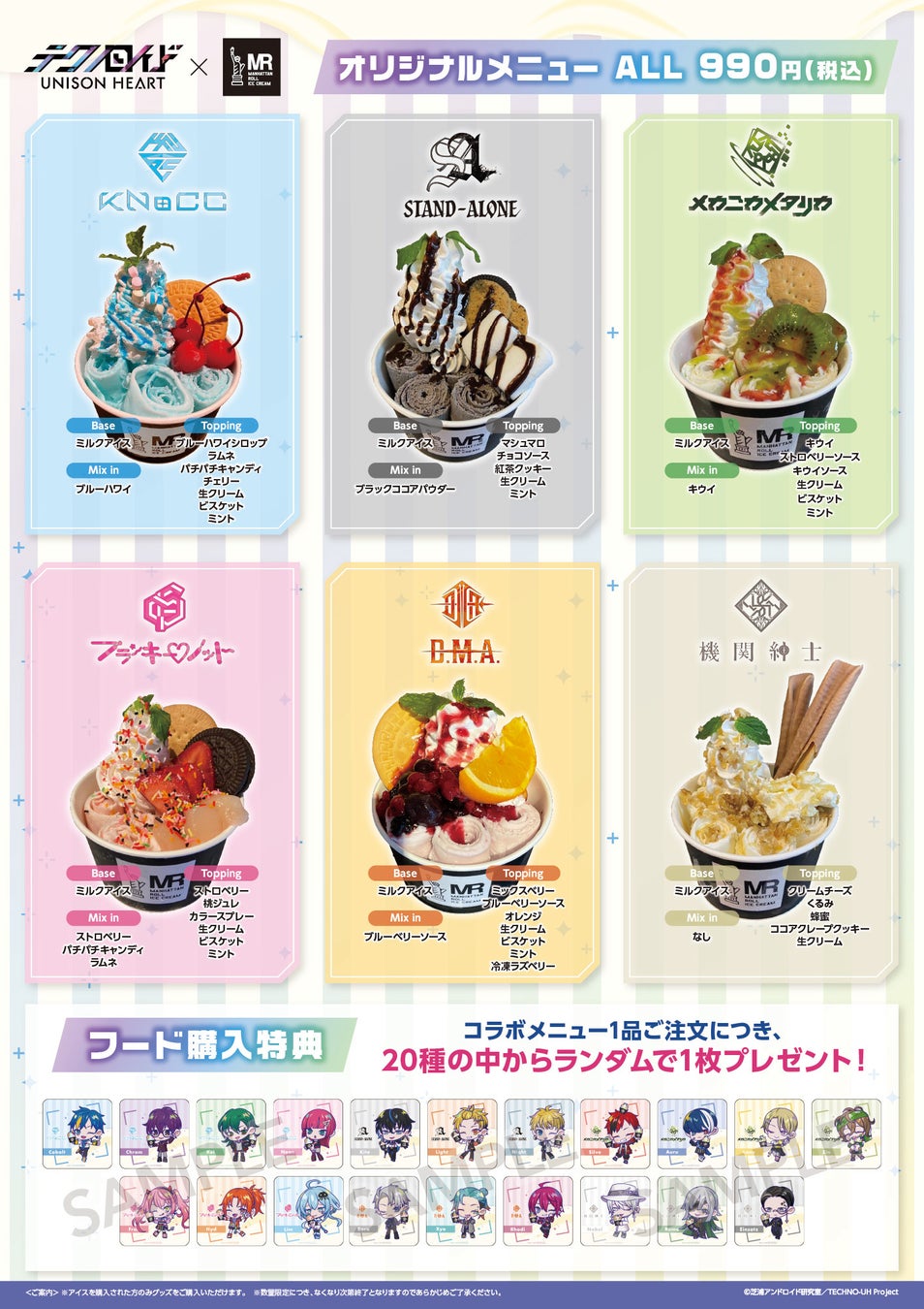 『テクノロイド』に登場する各ユニットをイメージした、ここでしか食べられない限定コラボアイスを6種類販売いたします。コラボアイスを1品ご注文につき、描き下ろし公式デフォルメイラストを使用した特典コースター(全20種)を、ランダムで1枚プレゼントいたします。