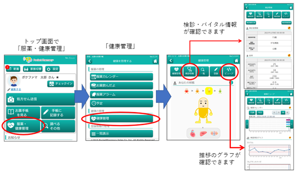 「ヘルスケアパスポート」導入医療機関の検査値記録は「ポケットファーマシー」に自動連携され、「ポケットファーマシー」を利用している薬局窓口では、ポケットファーマシーアプリ・プラットフォーム(管理画面)を通じ、連携された検査値を時系列・グラフで確認できます。