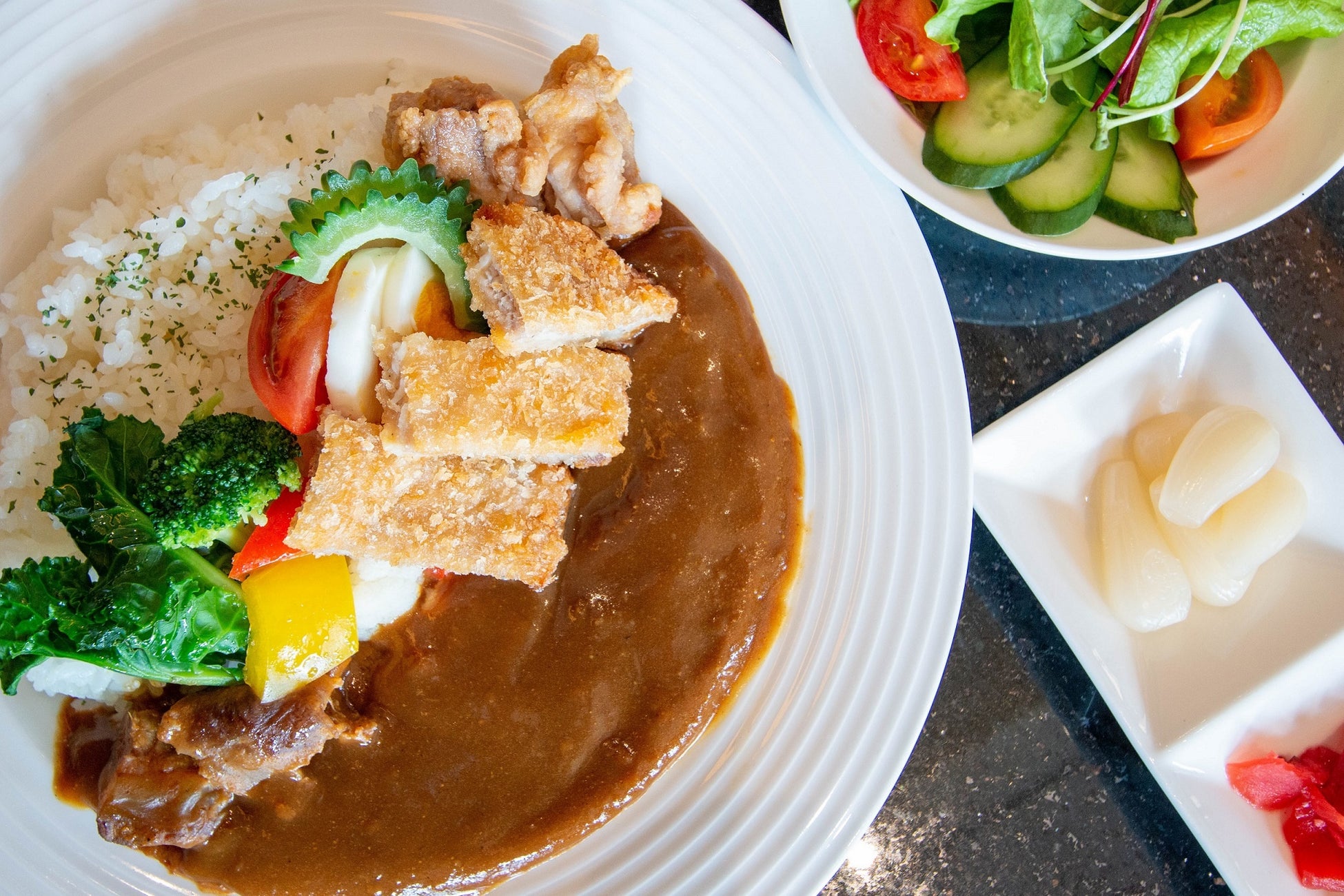 今年開業48周年となる沖縄ハーバービューホテルで受け継がれてきた伝統の味に旬のトレンドを加えたメニューとなり、沖縄食材にも工夫を加えた内容となります。メニューのなかには、会員数約30万人を誇る沖縄県民のおでかけを応援するサイト「ちゅらとく」で2022年1月~3月に開催された、【ちゅらとくカレーアワード2022】で県内14ホテルがエントリーしたなかで、第1位に選ばれた「ホテル特製カレーライス」を特別にご用意。オリジナルスパイスやEMトマトを入れてコクと旨味を増したカレーソースに「県産豚肉のトンカツ」や温野菜を添えて味わうことができます。