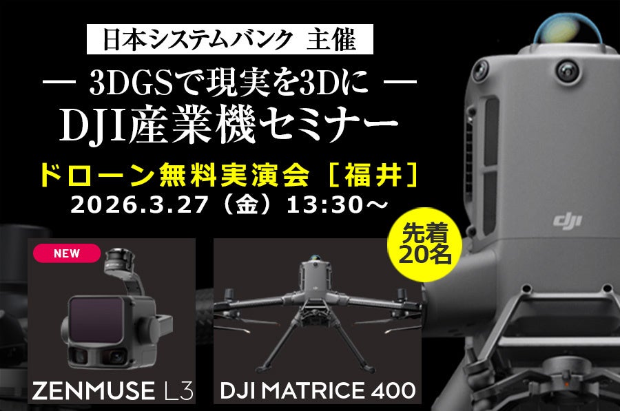 DJI(ディージェイアイ)正規販売代理店としてドローンビジネスの最前線を支える株式会社セキド(本社:東京都港区、代表取締役:大下貴之)は、日本システムバンク株式会社(本社:福井県福井市、代表取締役社長:野坂信嘉)主催により2026年3月27日(金)に福井県福井市で開催される「【3DGSで現実を3Dに】DJI産業機セミナー」に協力し、最新のDJI産業用ドローンおよび関連ソリューションを紹介します。