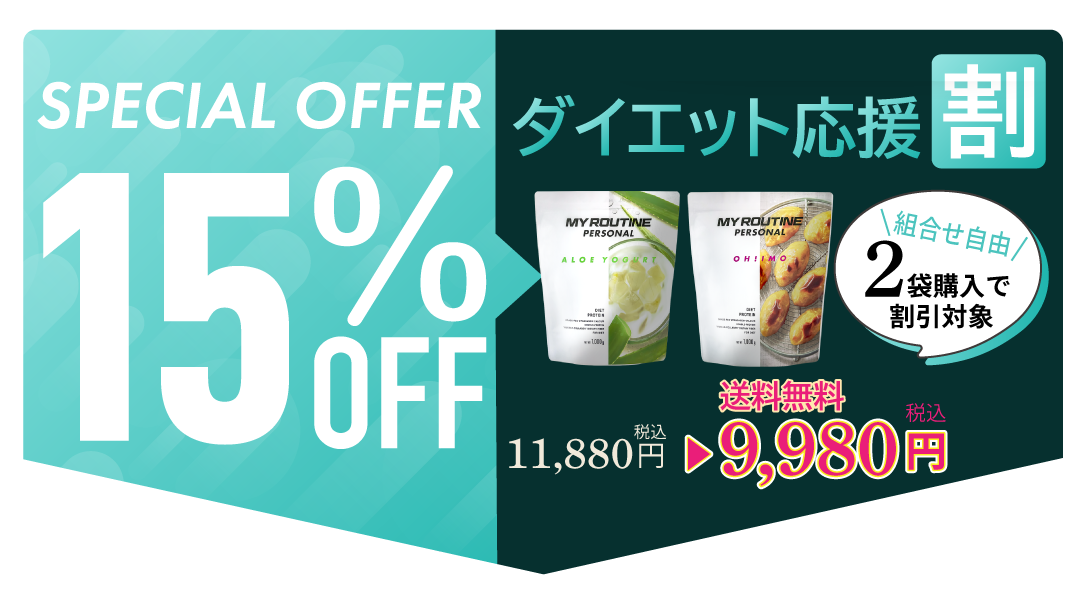 そこで、健康的に無理なくダイエットを提案するべく、マイルーティーン パーソナルのダイエットプロテインであるオイモ風味とアロエヨーグルト風味のセットを発売することになりました。通常各1袋 5,940円(税込)ですが、セット価格9,980円(税込)でお買い求め頂けます。