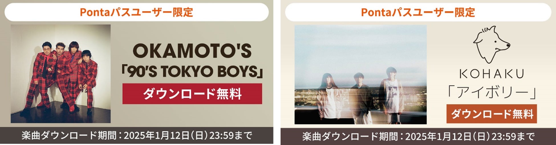 この度、Pontaパス会員のお客さまは、2024年12月13日10時から2025年1月12日23時59分まで約1カ月の期間限定で、OKAMOTO'S「90'S TOKYO BOYS」、KOHAKU「アイボリー」を無料ダウンロードいただけます。今回は「今、注目しておきたいアーティスト」をテーマに、2アーティスト同時に期間限定無料ダウンロードキャンペーンを実施することとなりました。