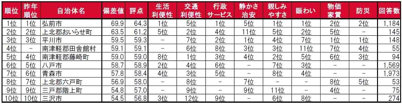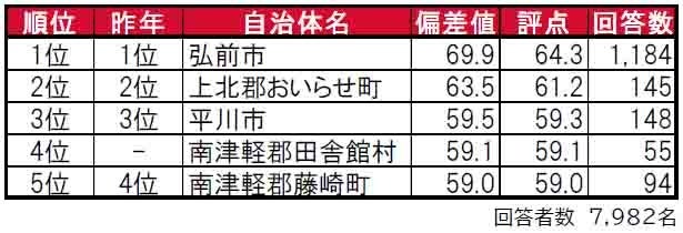 住みここちは、2年連続で1位弘前市、2位上北郡おいらせ町。3位は3年連続で平川市。