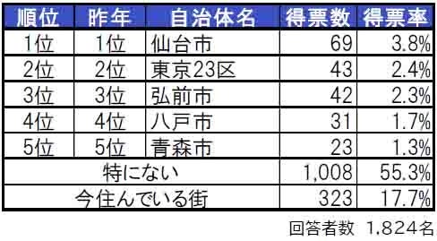 住みたい街1位は4年連続で仙台市。2位と3位は3年連続で東京23区と弘前市。