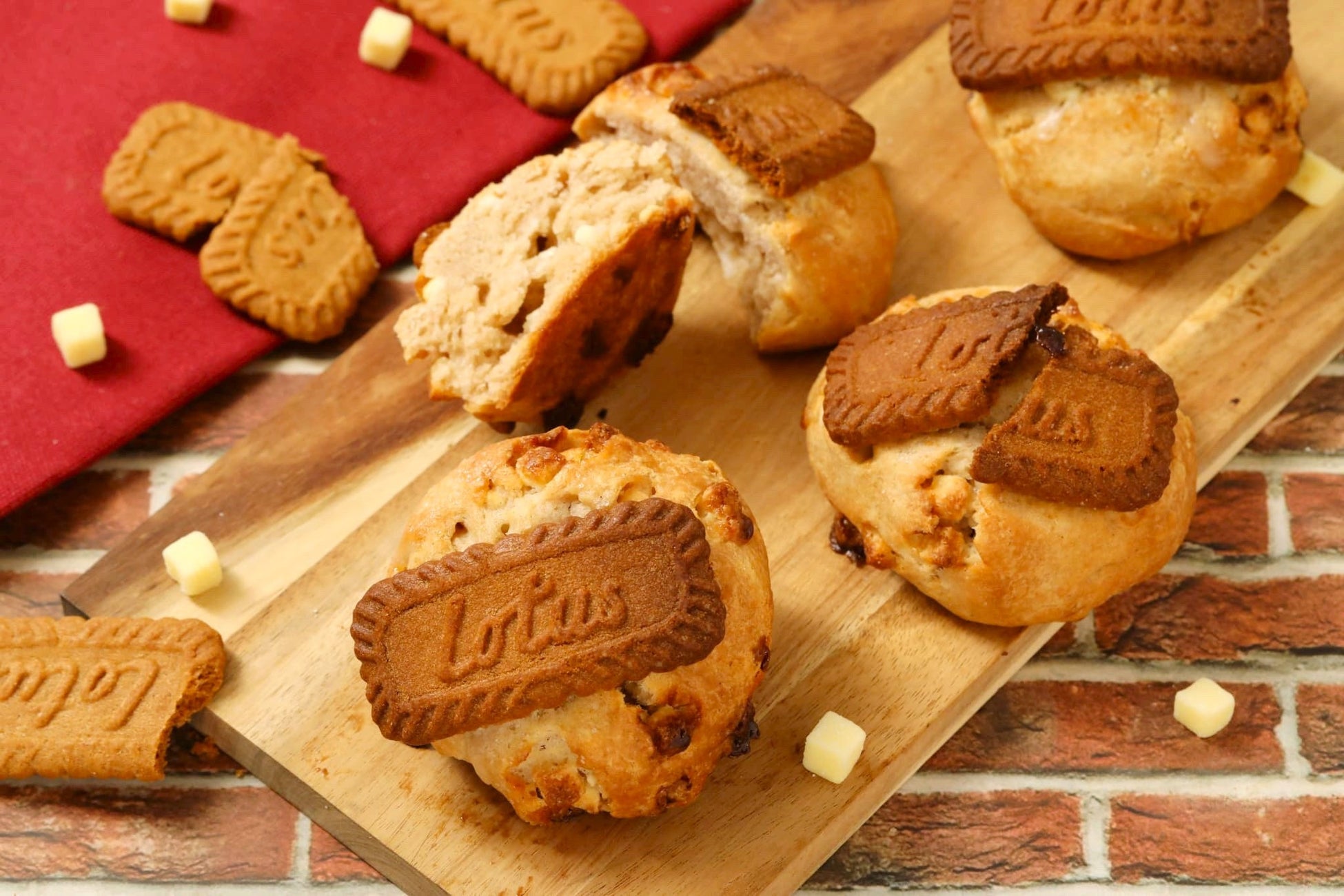 カルダモン、ホワイトチョコを練りこみ、ビスケットをトッピングして焼き上げました。シ