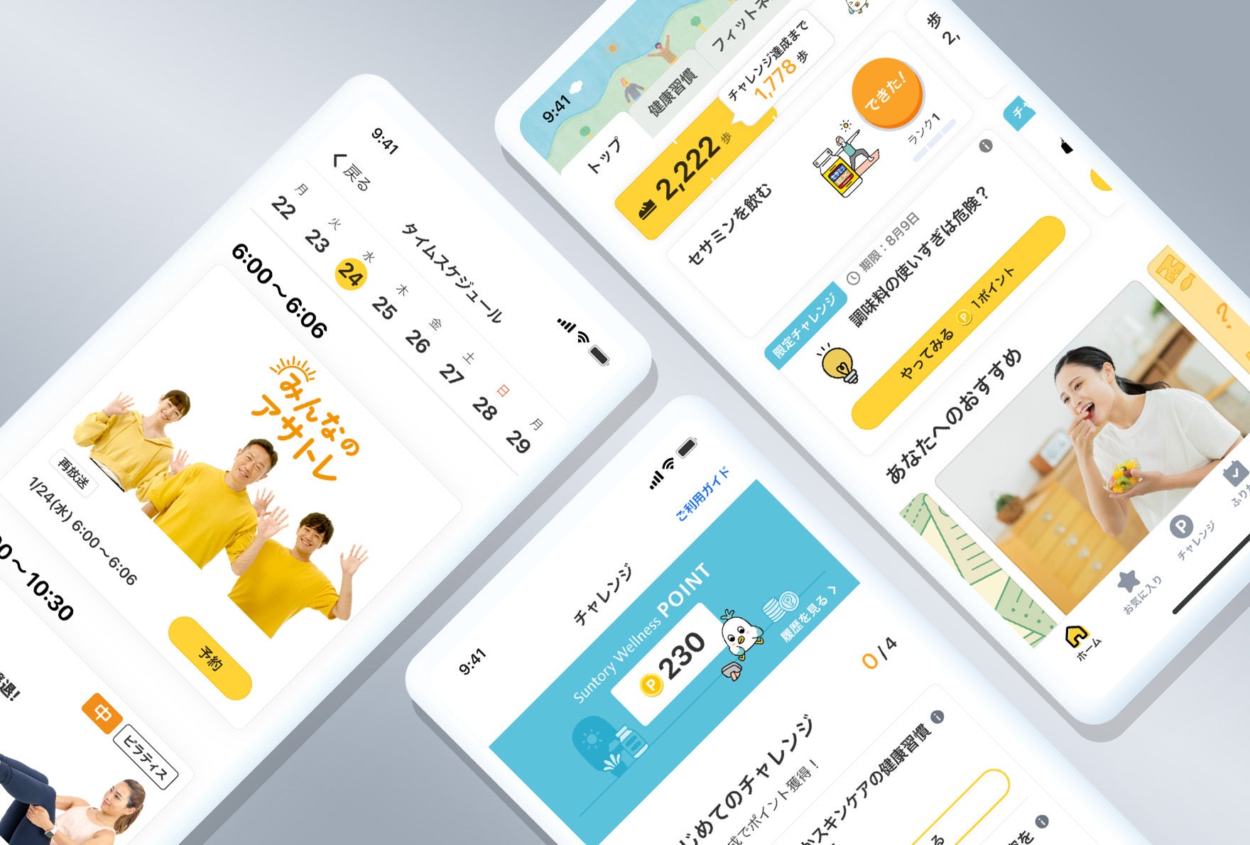 体の悩みに合わせた健康行動を気軽に習慣化しながらポイントが貯まる「サントリーウエルネスクラブ」会員向けの無料※4アプリです。専門機関監修の「いつもより長く歩く」「朝ごはんを食べる」といった、生活の中で簡単に取り組める健康行動の習慣化をサポートします。また、プロのインストラクターが監修した5分からできる簡単なフィットネスレッスンの配信や、体の健康知識からクイズや占いなど日々の楽しいコンテンツの提供、さらにはさまざまなイベント招待やプレゼント企画まで、お客様の暮らしを支える内容を用意しています。