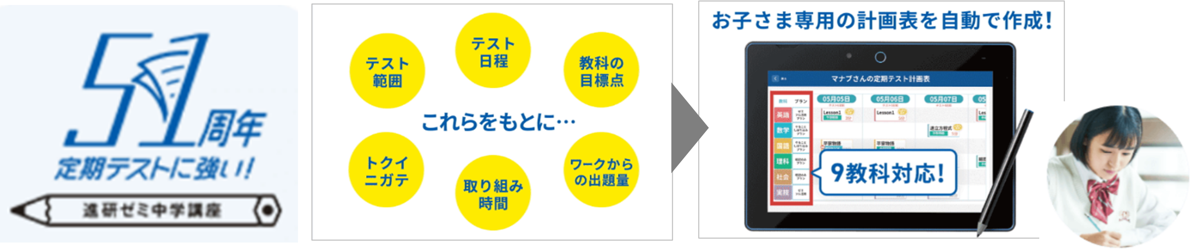 「進研ゼミ中学講座」は、一人ひとりのテスト日程や目標、取り組み時間に合わせて、専用の学習プランを自動で生成。「上手な勉強の仕方がわからない」と感じるお子さまでも迷うことなく学習に取り組める講座設計。自分のペースで学びながらも、1回1回のテストの本番で確実に結果を出し、志望校合格につなげられる教材にこだわり続けています。