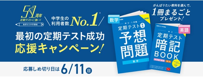 「進研ゼミ中学講座」“最初の定期テスト成功応援キャンペーン”6/11まで 入会手続き不要「定期テスト対策教材」申込者全員プレゼント