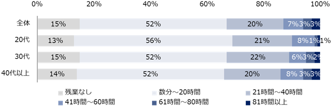 【図7】「正社員(フルタイム勤務)」の方に伺います。1ヵ月の残業時間を教えてください。(年代別)