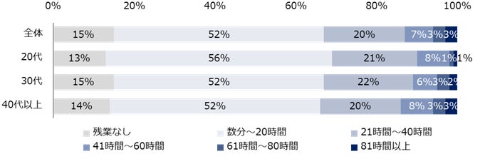 1ヵ月の残業時間、約7割が「20時間未満」。「81時間以上」は3%。23%が「残業代が規定通り支払われていない」と回答。