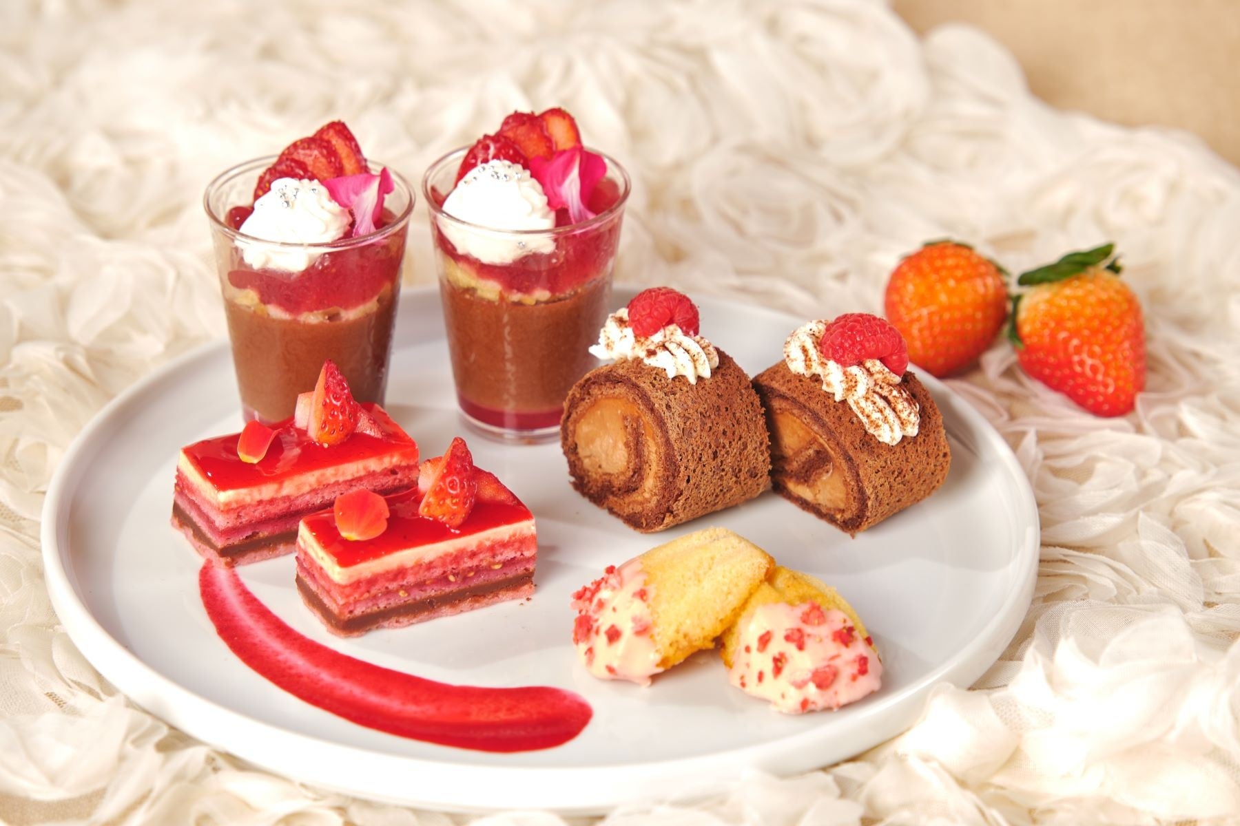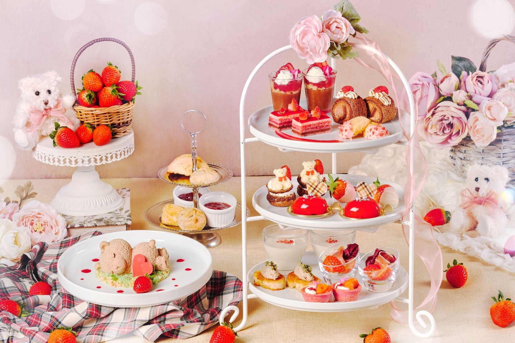 スイーツは、アイコニックなテディベア型のチョコレートがのったチョコレートシュークリームをはじめ、チェック柄のハートのプレートショコラと真っ赤なカラーが目を惹く「いちごのムース」、ホワイトショコラにディップした丸ごとフレッシュいちごなど一つ一つのスイーツにいちご要素を取り入れました。さらに、濃厚なチョコレートとさわやかないちごにクランブルの食感がアクセントとなったヴェリーヌ、チョコといちごが美しい層を織りなすオペラなど、いちごの酸味とチョコレートの甘みをバランスよく盛り込んだパティシエ特製の全7種のスイーツ、3種の軽食、焼き立てのスコーン2種をご堪能いただけます。