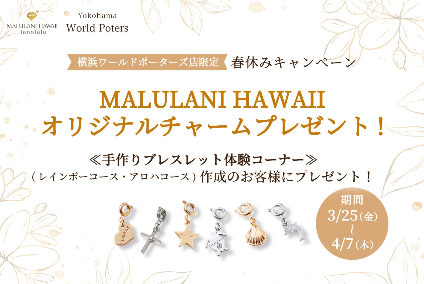 春休み限定! ハワイ発「マルラニハワイ」横浜ワールドポーターズ店にて、「手作り体験ブレスレット」を作成の方にオリジナルチャームをプレゼント!