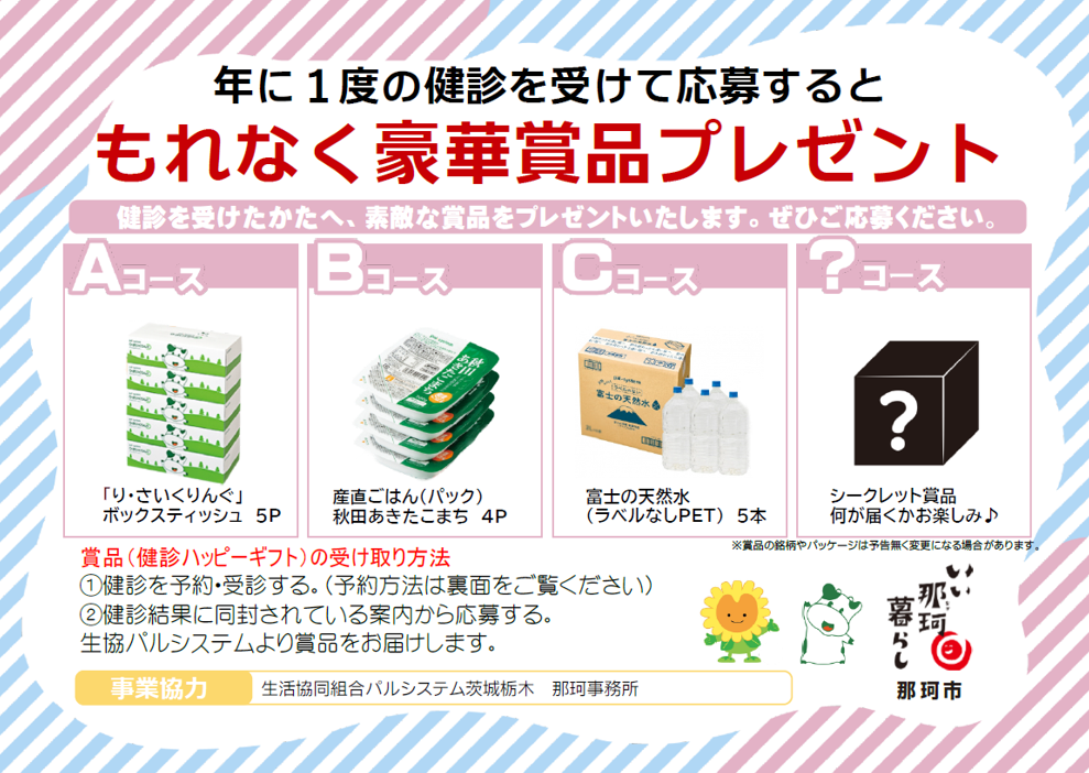 協定書に基づき那珂市は、血液検査や身体計測などが受けられる特定健康診査の案内時に「健診ハッピーギフト」の案内カードを配付します。希望者は健診の受診後、健診結果に同封する用紙から応募できます。