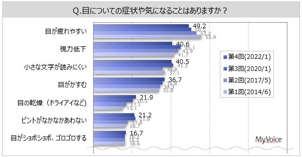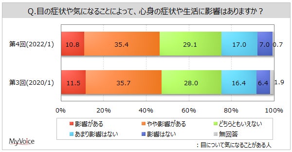 マイボイスコム株式会社(東京都千代田区、代表取締役社長:高井和久)は、インターネット調査を中心に提供している伊藤忠グループのリサーチ会社です。この度、4回目となる『目の健康』に関するインターネット調査を2022年1月1日~5日に実施し、10,005件の回答を集めました。調査結果をお知らせします。