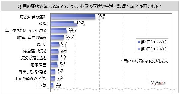 【目の健康に関する調査】目について気になることがある人のうち、目の症状によって心身などに影響がある人は約46%。「肩こり、首の痛み」が4割弱、「頭痛」「集中できない、イライラする」などが10%台