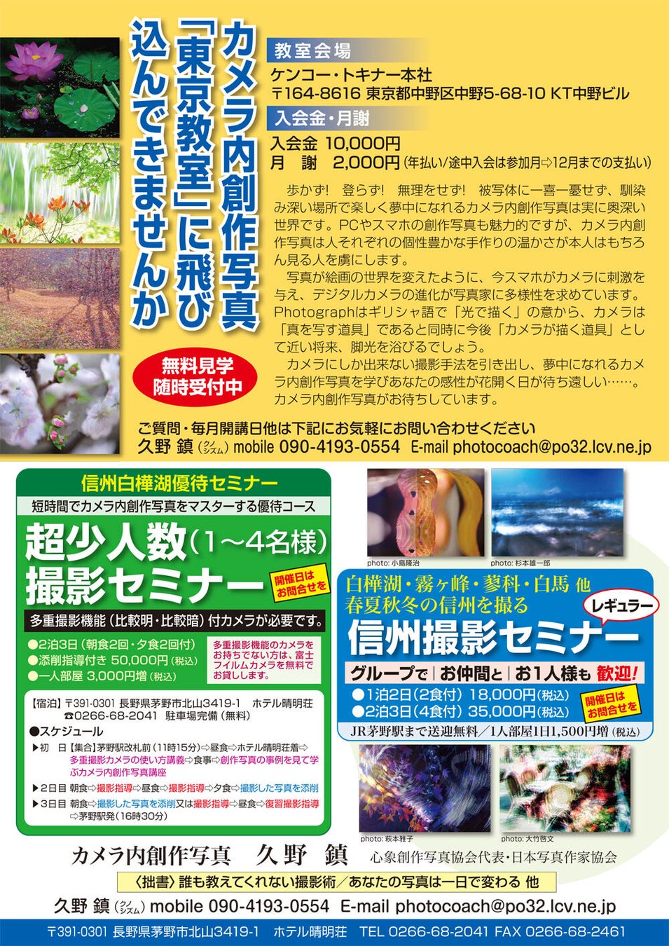 カメラ内創作写撮影手法講座・写真添削・ケンコー・トキナ―のレンズ、フイルター、写真用品ほかの使い方・新製品他説明・合同写真展・撮影会・カメラ内創作写真指導者養成アドバイス・コンテスト作品添削・個展、写真集作成相談